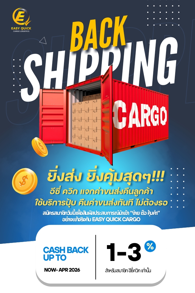 สมัครใช้บริการเพราะเราเข้าใจดีว่าทุกการนำเข้า คือโอกาสทางธุรกิจของคุณ Easy Quick Cargo จึงมุ่งมั่นที่จะเป็นพาร์ทเนอร์ที่เชื่อถือได้ ด้วยบริการที่รวดเร็ว โปร่งใส และเป็นมิตร พร้อมสนับสนุนให้ธุรกิจของคุณเติบโตได้อย่างมั่นใจในทุกเส้นทาง และนี่คือข้อเสนอ แคมเปญส่งเสริมการขายสุดพิเศษสำหรับสมาชิกเท่านั้น