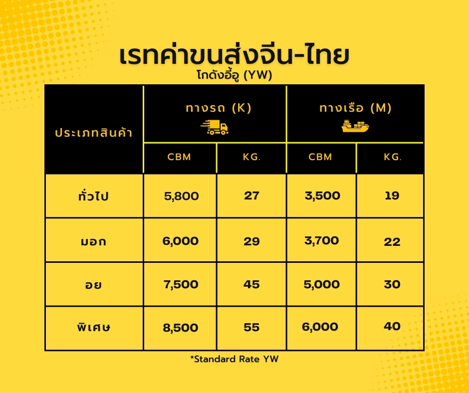 อัตราค่าขนส่งสินค้าจากจีนโกดังอี้อู-ไทย (Shipping Rate) แบบแชร์ตู้สินค้า จะคิดค่าบริกาตามรูปแบบการใช้บริการของลูกค้า ทางรถหรือทางเรือ และ ประเภทของสินค้าที่ขนส่งเป็นหลัก โดยเรทค่าบริการในตารางเป็นราคาเริ่มต้น (Standard Rate) สำหรับลูกค้าทั่วไปที่เริ่มต้นใช้บริการกับ อีซี่ ควิก คาร์โก้